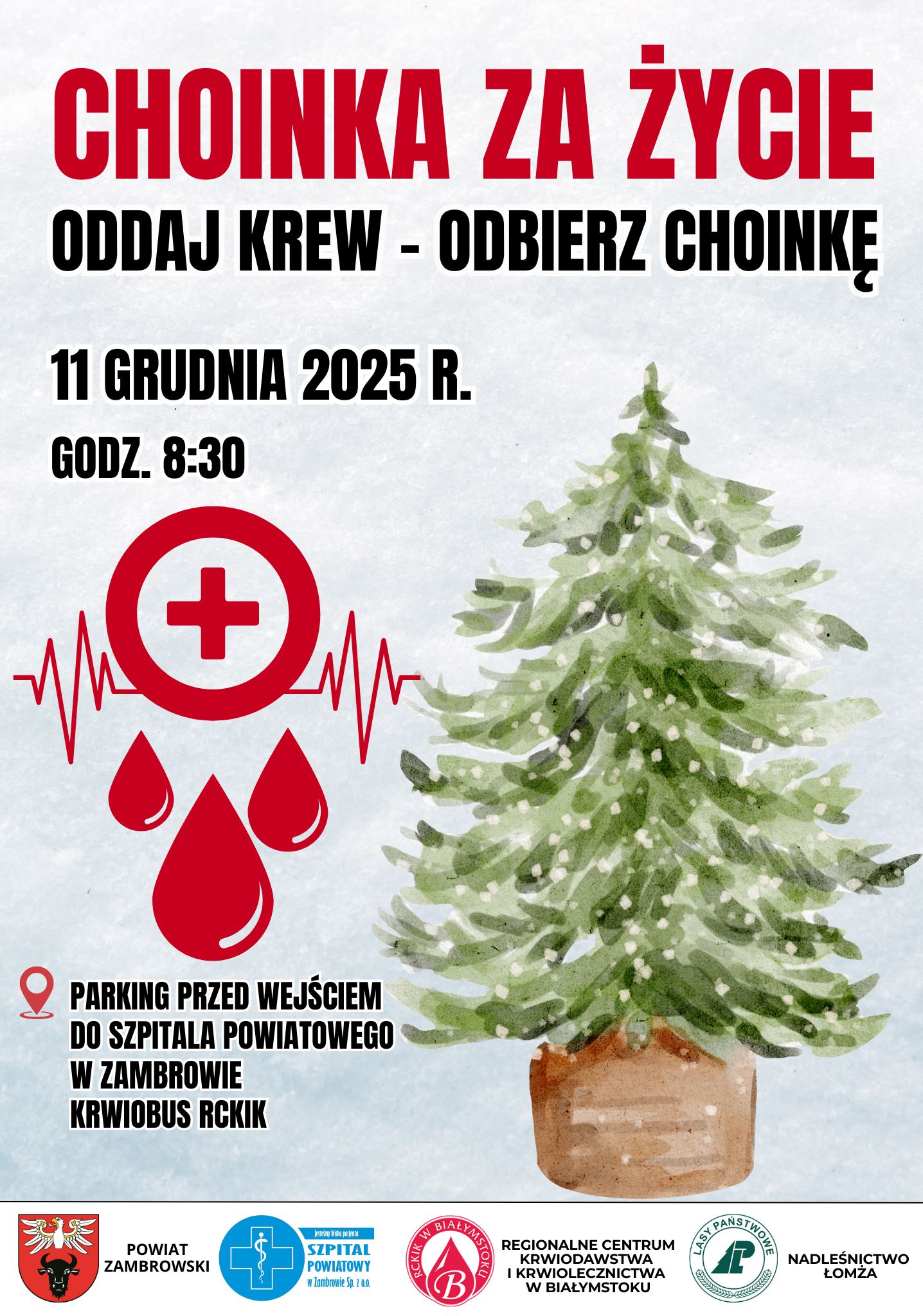 Każda osoba, która zdecyduje się oddać krew, otrzyma w podziękowaniu świąteczną choinkę. Drzewka zostały ufundowane przez Starostę i Wicestarostę Zambrowskiego, Prezesa Szpitala oraz Pracowników Szpitala.