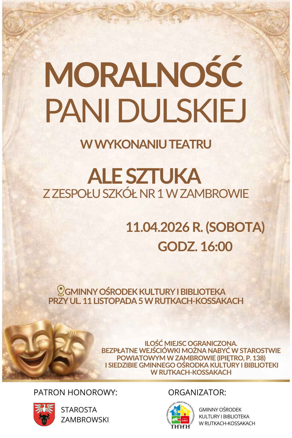 Miłośnicy teatru oraz mieszkańcy regionu mogą już zaplanować sobotnie popołudnie w wyjątkowy sposób. Powiat Zambrowski, we współpracy z Gminnym Ośrodkiem Kultury i Biblioteką w Rutkach-Kossakach, przygotował wydarzenie, które z pewnością przyciągnie uwagę zarówno wielbicieli klasyki, jak i osób szukających wartościowej formy spędzenia wolnego czasu. Na scenie pojawi się ponadczasowy dramat Gabrieli Zapolskiej „Moralność Pani Dulskiej”, który od lat pozostaje jednym z najważniejszych tekstów polskiej literatury obyczajowej, nie tracąc przy tym swojej aktualności.