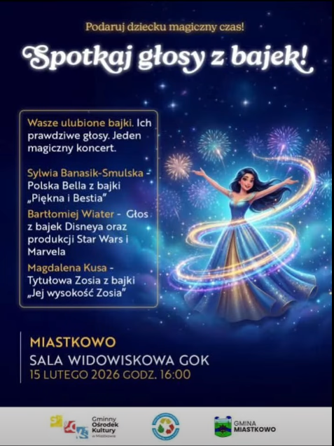 15 lutego o godz. 16:00 sala widowiskowa Gminnego Ośrodka Kultury w Miastkowie wypełni się dźwiękami znanymi z kultowych animacji i filmów. Podczas wyjątkowego koncertu mieszkańcy będą mogli usłyszeć polskie głosy bohaterów takich produkcji jak Kraina lodu, Piękna i Bestia czy Gwiezdne Wojny.
