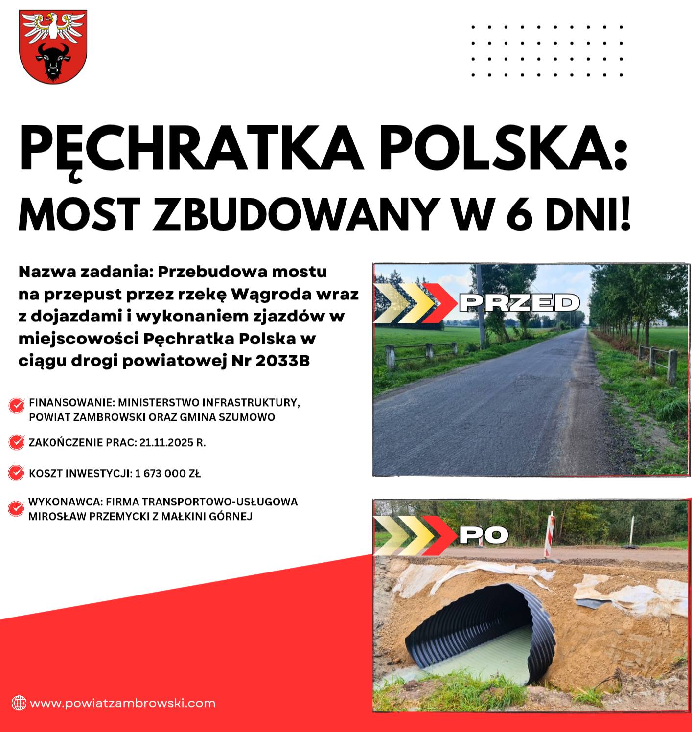 Znakomite wieści z powiatu! Zakończono kluczowy etap inwestycji w Pęchratce Polskiej, gdzie powstał nowy most na rzece Wągroda. To część zadania pod nazwą „Przebudowa mostu na przepust przez rzekę Wągroda wraz z dojazdami i wykonaniem zjazdów w miejscowości Pęchratka Polska w ciągu drogi powiatowej Nr 2033B”. Projekt ma ogromne znaczenie dla lokalnej społeczności – poprawi bezpieczeństwo kierowców, pieszych oraz wszystkich użytkowników drogi, a także wpłynie na komfort podróżowania w tej części regionu.