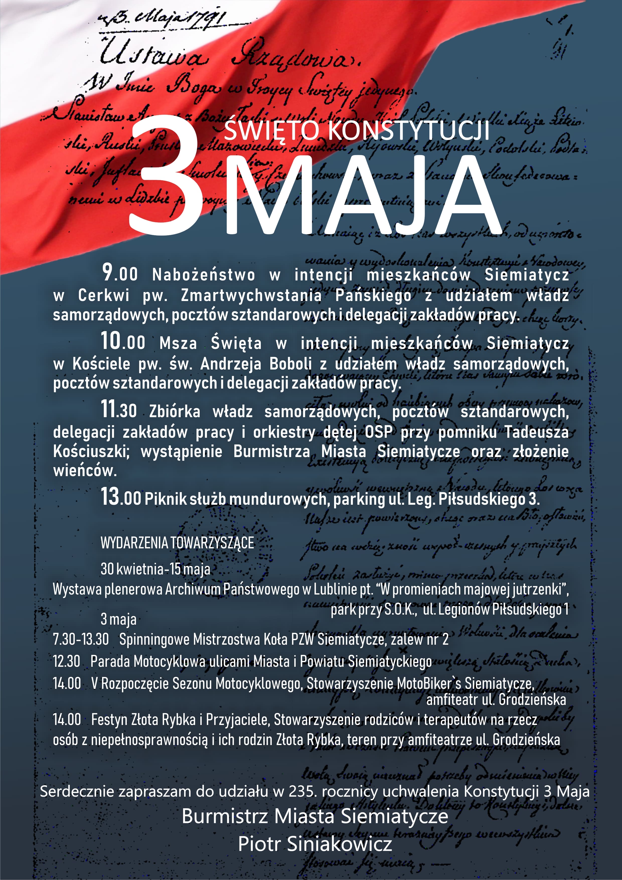 W Siemiatyczach przygotowano rozbudowany program obchodów 235. rocznicy uchwalenia Konstytucji 3 Maja. Tegoroczne wydarzenia będą miały charakter religijny, patriotyczny i rekreacyjny, tworząc przestrzeń do wspólnego świętowania dla mieszkańców w różnym wieku.